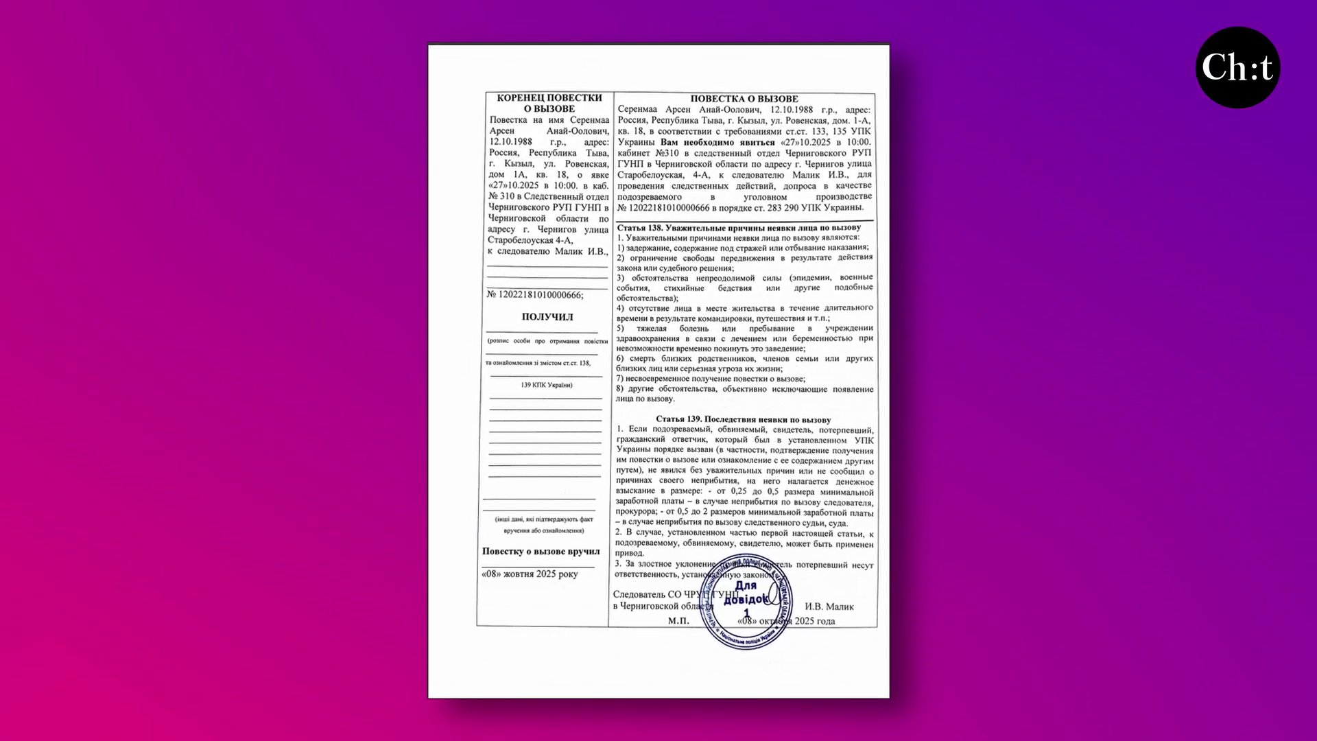 На Чернігівщині тривають судові процеси над військовими злочинцями. Черговий суд почався над окупантом, якого обвинувачують у злочинах проти мирного населення. Житель російського міста Кизил з непростими ініціалами - Серенмаа Арсен Анай-Оолович внесений до бази Миротворця, як військовий злочинець. Він у складі окупаційних військ 55 окремої мотострілкової бригади разом з іншими загарбниками 4 березня 2022 року на дорозі між селами Золотинка та Друцьке стріляв у цивільних, які отримали вогнепальні поранення.
