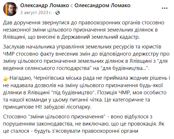 Торік у дописі від 3 серпня чиновник повідомив, що «Чернігівська міська рада не приймала жодних рішень і не надавала дозволів на зміну цільового призначення будь-якої ділянки в Ялівщині «під будівництво».